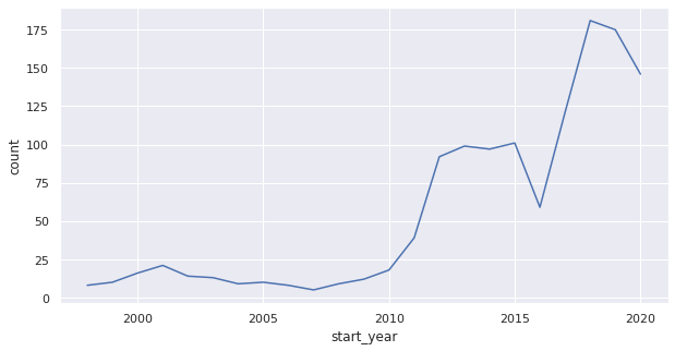 sns.lineplot(data=tmp, x="start_year", y="count")