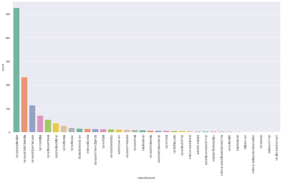 ax = sns.countplot(x='manufacturer', data=df, palette='Set 2', order=tmp.index)