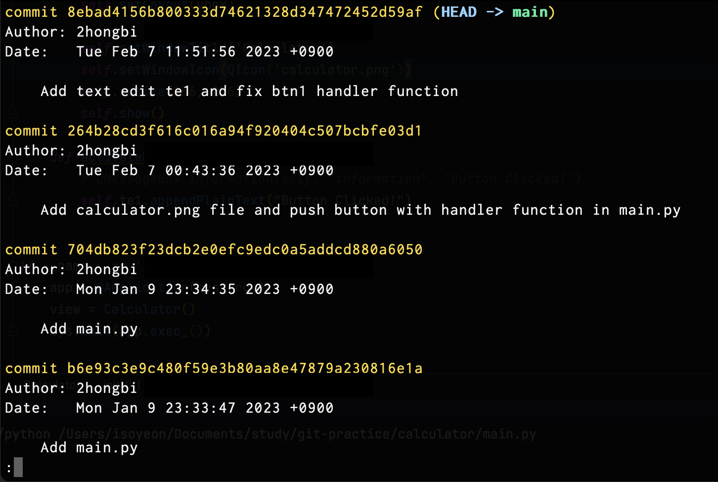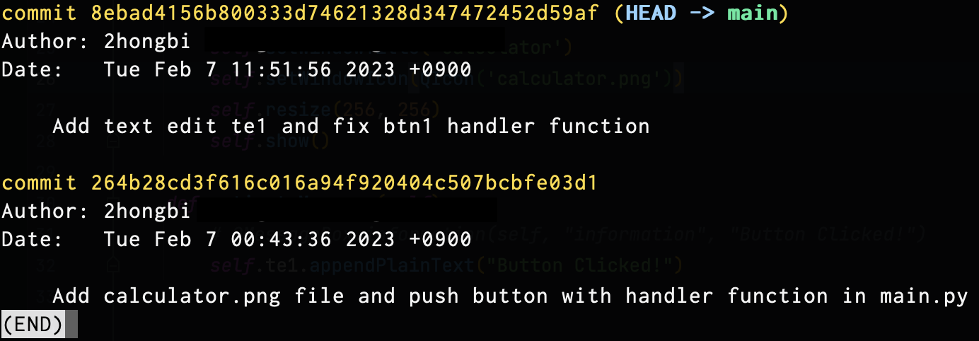 다음은 git log -2 를 입력한 결과다. 최근 2개의 커밋만 출력된 것을 볼 수 있다.