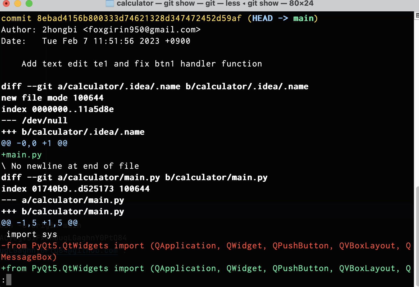 가장 최근 커밋(8ebad4156)의 상세 정보를 출력하며, git log -p -1의 실행결과와 같다.